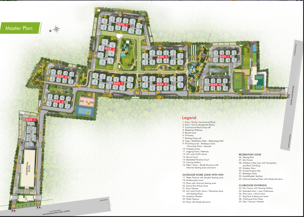 reflexology path, peaceful water bodies, shaded seating pockets, and lush